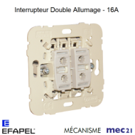 Le mécanisme référence 21065 est un interrupteur double de la série MEC21, conçu pour contrôler simultanément ou séparément deux groupes de lumières ou deux appareils électriques depuis un emplacement unique. Il est nécessaire de l'associer à un enjoliveur (doigt) double de la gamme choisie.