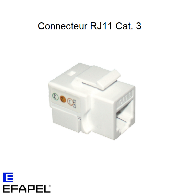 Connecteur RJ11 Cat.3 Efapel (Réf. 21972) est un module de raccordement mural pour les installations de téléphonie analogique ou de petit réseau de données de base. Il est de catégorie Cat.3, compatible avec les anciennes prises téléphoniques RJ11 et utilise des bornes sans outil pour un câblage simple et rapide.