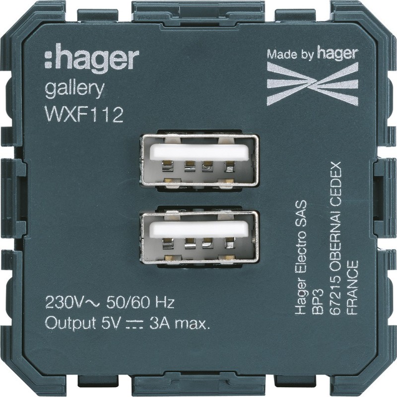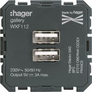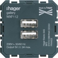 Le Chargeur double USB A+A Gallery WXF112 Hager recharge simultanément deux appareils électroniques via des ports USB intégrés dans une prise murale.